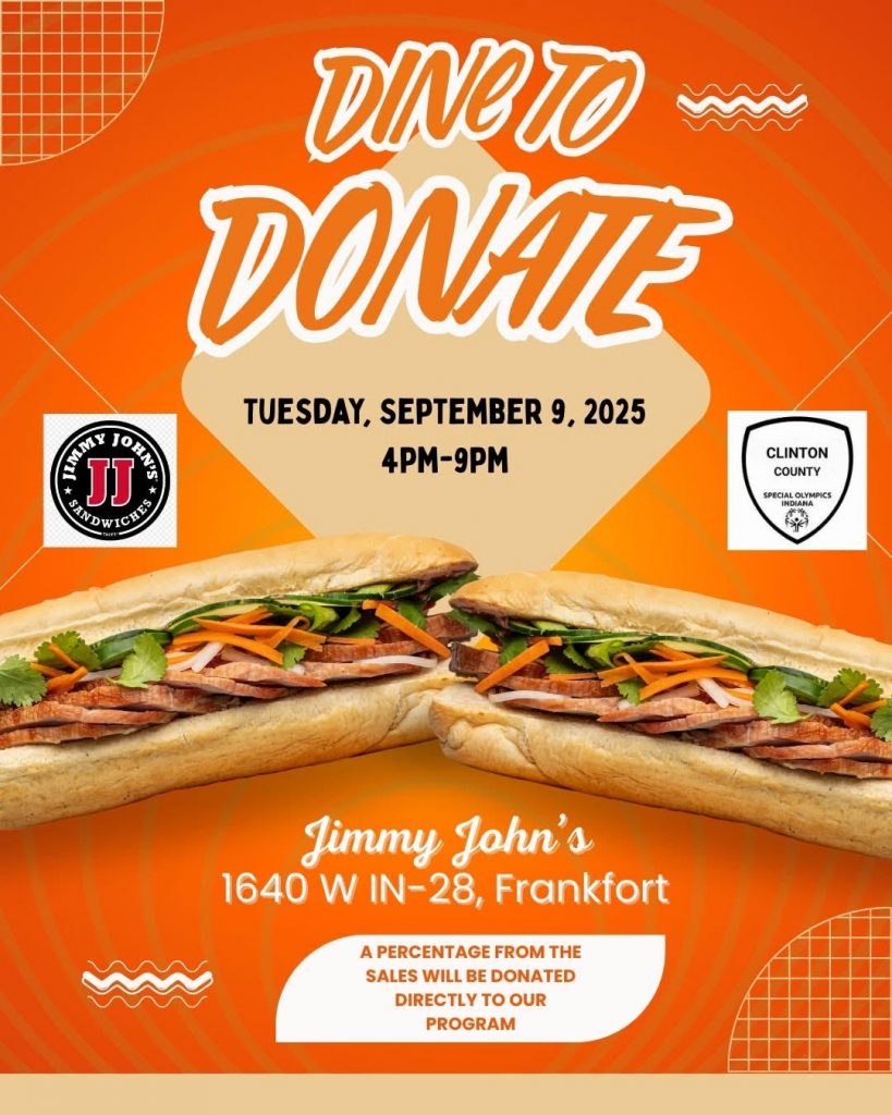 Local residents will have the chance to support Special Olympics athletes in Clinton County while grabbing a sandwich next week. On Tuesday, September 9, 2025, Jimmy John’s at 1640 W. IN-28 in Frankfort will host a “Dine to Donate” fundraiser from 4 p.m. to 9 p.m. During that time, a percentage of all sales will […]
